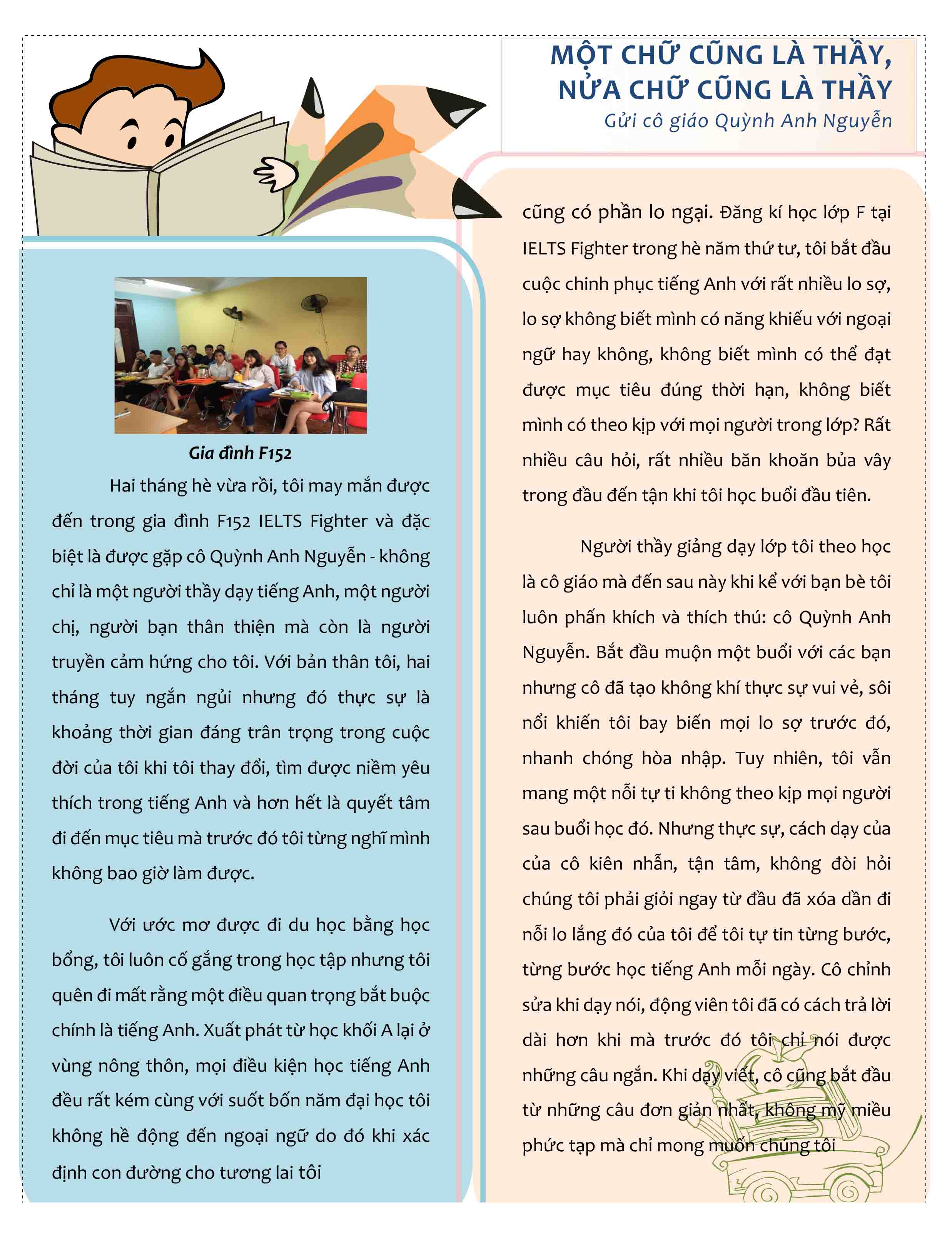 Hai tháng hè vừa rồi, tôi may mắn được đến trong gia đình F152 IELTS Fighter và đặc biệt là được gặp cô Quỳnh Anh Nguyễn - không chỉ là một người thầy dạy tiếng Anh, một người chị, người bạn thân thiện mà còn là người truyền cảm hứng cho tôi. Với bản thân tôi, hai tháng tuy ngắn ngủi nhưng đó thực sự là khoảng thời gian đáng trân trọng trong cuộc đời của tôi khi tôi thay đổi, tìm được niềm yêu thích trong tiếng Anh và hơn hết là quyết tâm đi đến mục tiêu mà trước đó tôi từng nghĩ mình không bao giờ làm được.