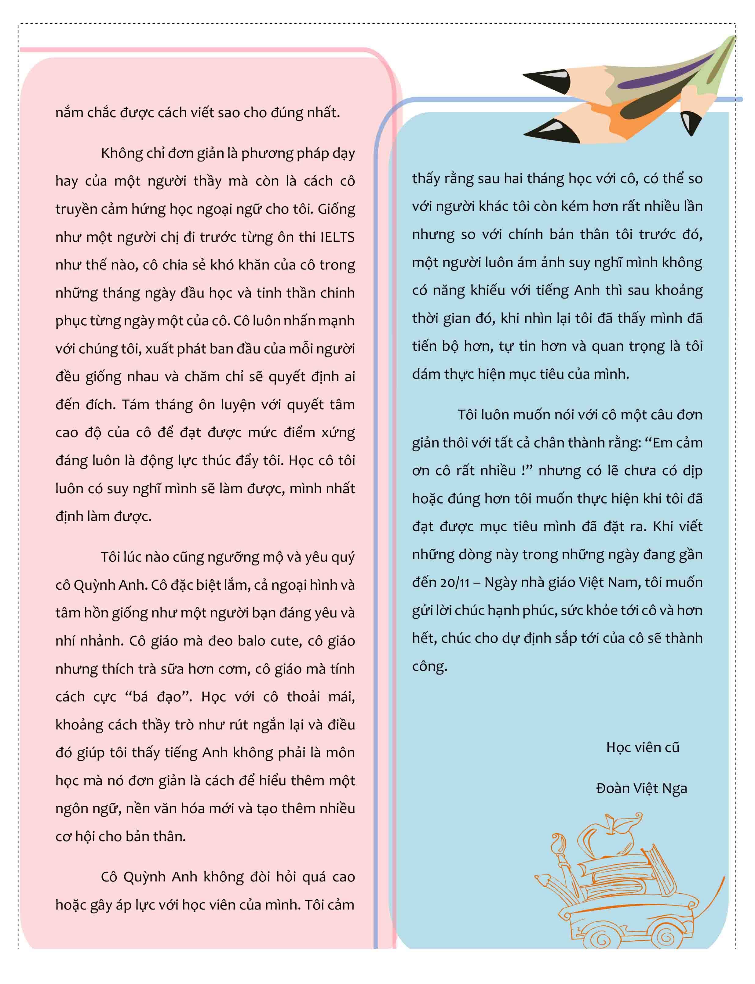 Đoàn Việt Nga - F152 - Hai tháng hè vừa rồi, tôi may mắn được gặp cô Quỳnh Anh Nguyễn - không chỉ là một người thầy dạy tiếng Anh, một người chị, người bạn thân thiện mà còn là người truyền cảm hứng cho tôi.