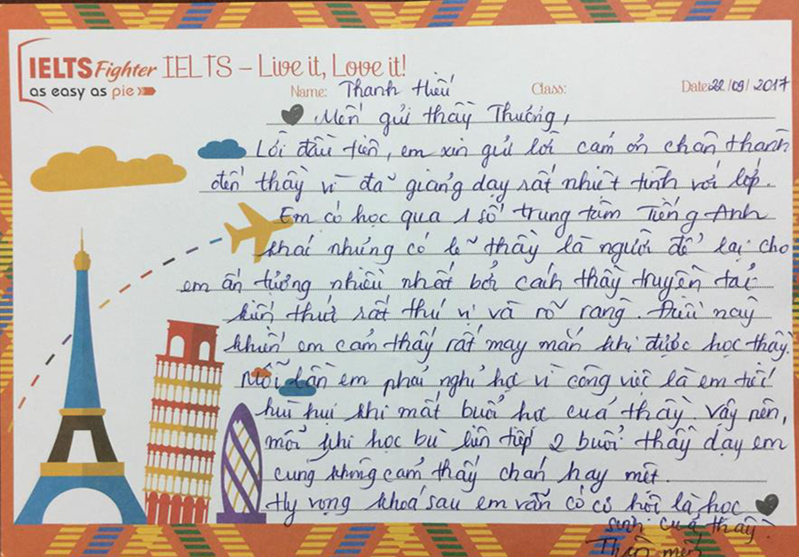 Em có học qua một số trung tâm tiếng Anh khác nhưng có lẽ thầy là người để lại cho em ấn tượng nhiều nhất bởi cách thầy truyền tải kiến thức rất thú vị và rõ ràng. Điều này khiến em cảm thấy rất may mắn khi được học thầy.
