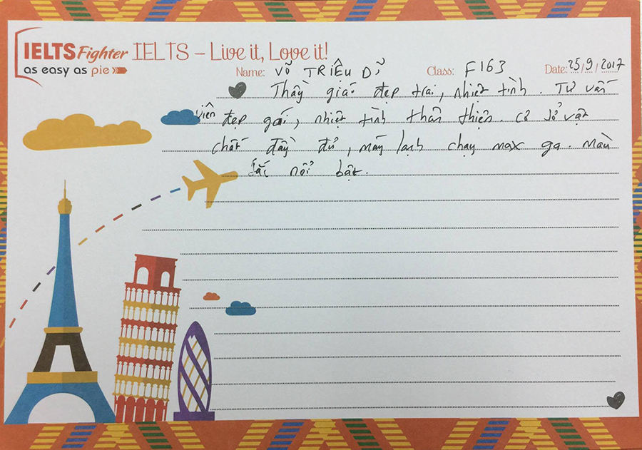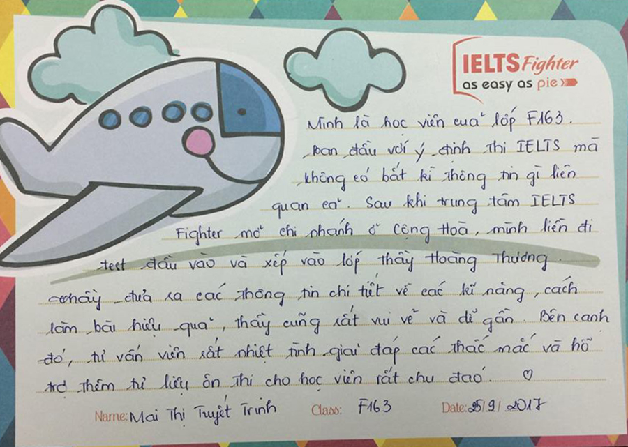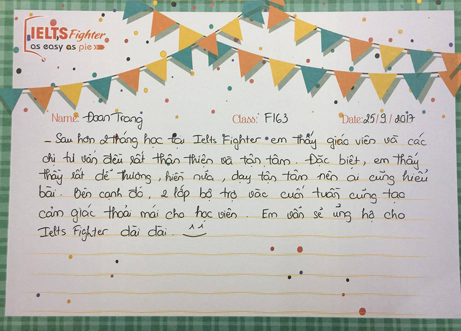 Đoan Trang: Em thấy giáo viên và các chị tư vấn đều rất thân thiện và tận tâm. Đặc biệt, em thấy thầy rất dễ thương, hiền nữa, dạy tận tâm nên ai cũng hiểu bài. Bên cạnh đó, 2 lớp bổ trợ vào cuối tuần cũng tạo cảm giác thoải mái cho học viên. Em sẽ ủng hộ IELTS Fighter dài dài ^^