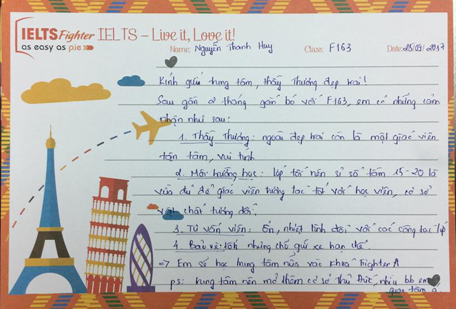 Tuy chỉ học cùng nhau trong quãng thời gian không dài nhưng đã để lại biết bao những kỉ niệm đáng nhớ của tập thể F163 cùng Mr Thương. Hãy cùng IELTS Fighter lắng nghe những chia sẻ của các bạn học viên sau thời gian học tập tại trung tâm nhé!