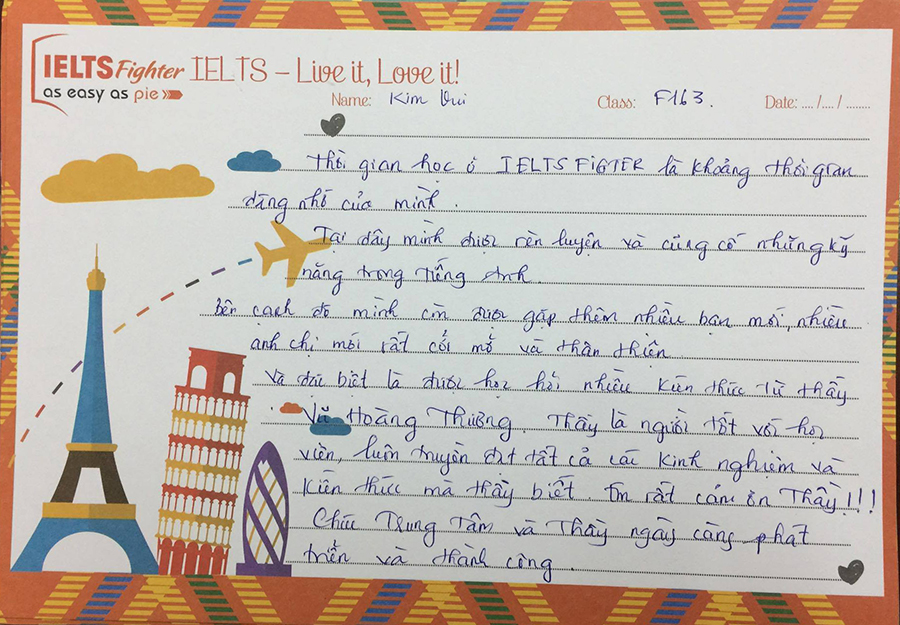 Kim Vui: Thời gian học ở IELTS Fighter là khoảng thời gian đáng nhớ của mình. Tại đây mình được rèn luyện và củng cố những kỹ năng trong tiếng Anh.
