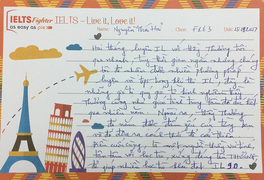 Nguyễn Thái Hải: Hai tháng luyện IELTS với thầy Thương trôi qua nhanh, tuy thời gian ngắn nhưng chúng tôi đã nhận được nhiều phương pháp luyện và tips trong kỳ thi IELTS, đây là những giá trị quý giá từ kinh nghiệm thầy Thương cũng như giáo trình trung tâm đã đúc kết qua nhiều năm. Ngoài ra thầy Thương đã nắm được điểm yếu của từng bạn và đã đưa ra cách thức để cải thiện.