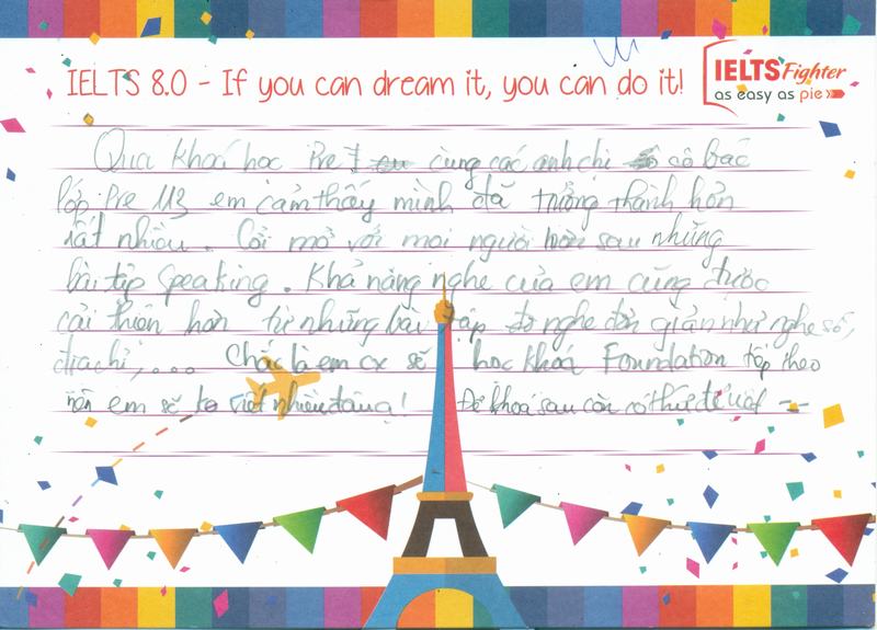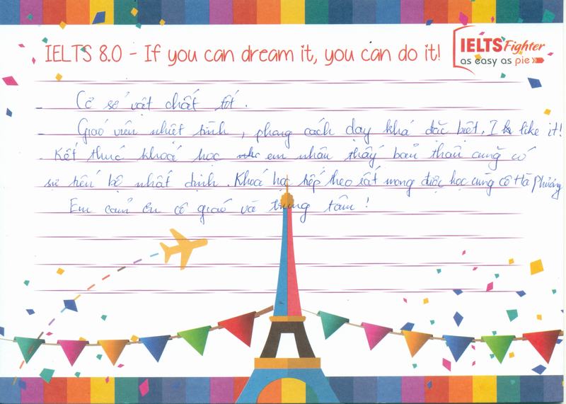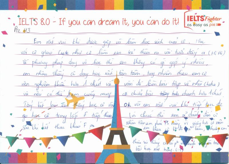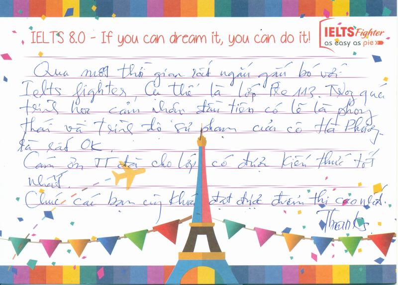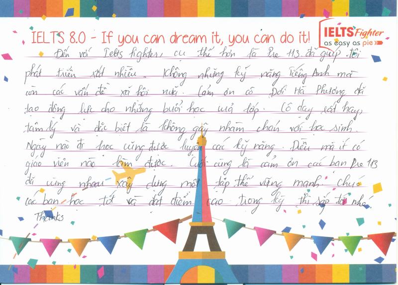 Đến với IELTS Fighter, cụ thể hơn là Pre113 đã giúp tôi phát triển rất nhiều. Không những kỹ năng tiếng Anh mà còn các vấn đề xã hội nữa. Cảm ơn cô Đới Hà Phương đã tạo động lực cho những buổi học của lớp. Cô dạy rất hay, tâm lý và đặc biệt là không gây nhàm chán với học sinh. Ngày nào đi học cũng được luyện các kỹ năng. Điều mà ít có giáo viên nào làm được. Cuối cùng là cảm ơn các bạn Pre 113 đã cùng nhau xây dựng một tập thể vững mạnh. Chúc các bạn học tốt và đạt điểm cao trong kỳ thi sắp tới nhé!