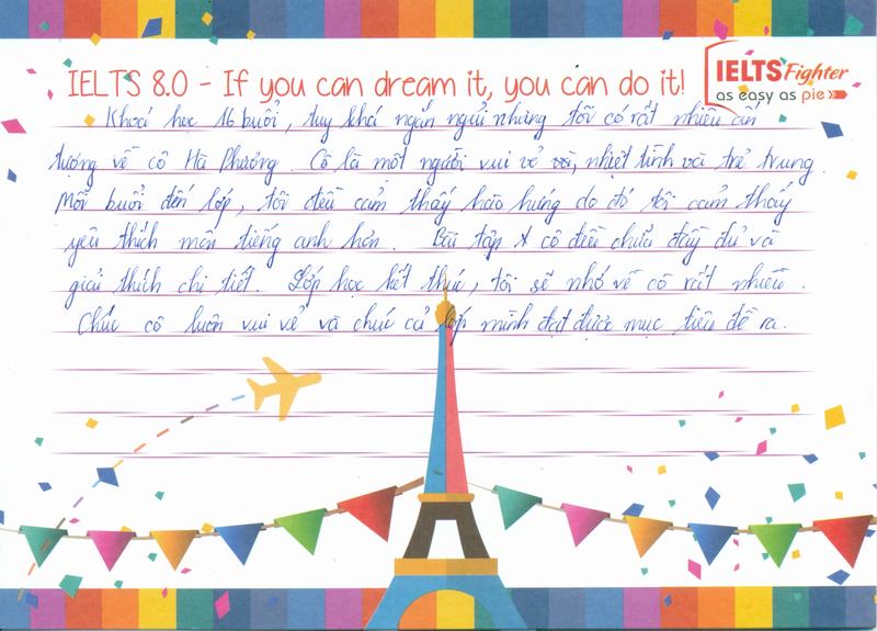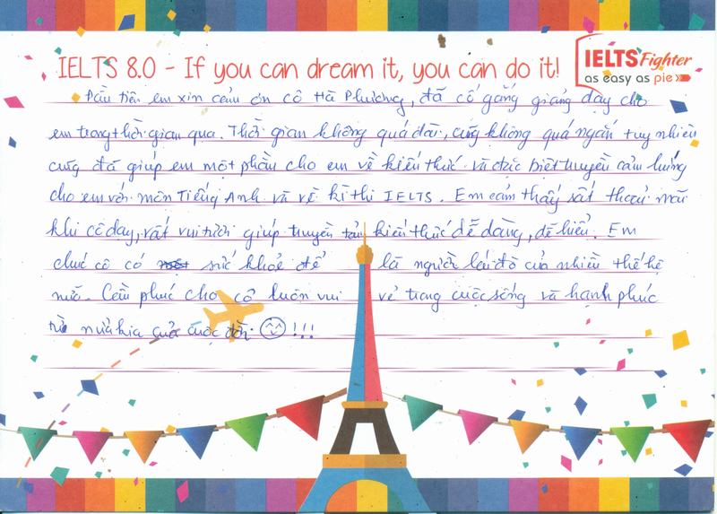 Đầu tiên em xin cảm ơn cô Hà Phương, đã cố gắng giảng dạy cho em trong thời gian qua. Thời gian không quá dài, cũng không quá ngắn, tuy nhiên cũng đã giúp em một phần cho em về kiến thức và đặc biệt truyền cảm hứng cho em với môn tiếng Anh và về kỳ thi IELTS. Em cảm thấy rất thoải mái khi cô dạy, rất vui tươi, giúp truyền tải kiến thức dễ dàng, dễ hiểu.