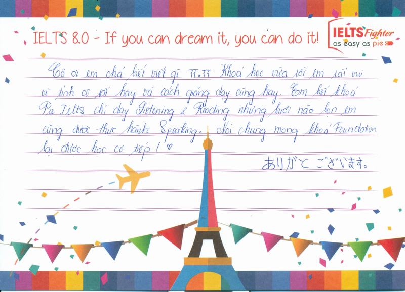 Cô ơi em chả biết viết gì TT.TT Khóa học vừa rồi em rất vui vì tính cô rất hay và cách giảng dạy cũng hay. Em biết khóa Pre IELTS chỉ dạy Listening & Reading nhưng buổi nào bọn em cũng được thực hành Speaking. Nói chung mong khóa Foundation lại được học cô tiếp! <3