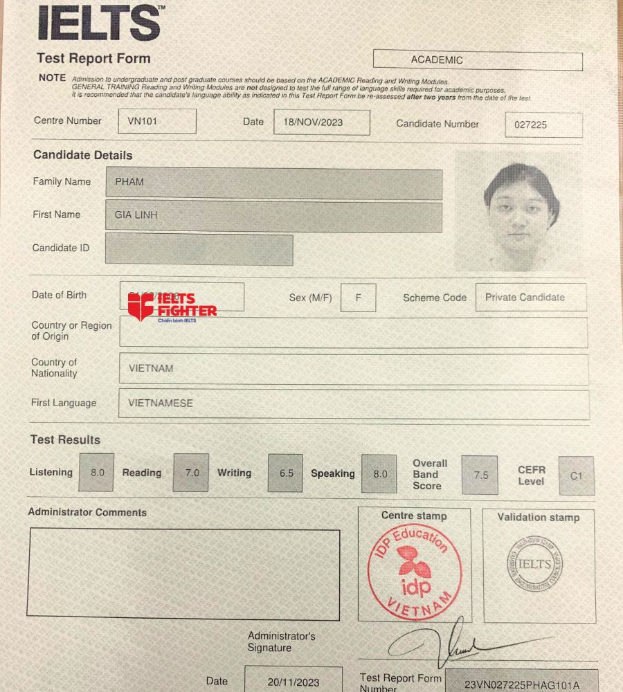 Nhờ sự nỗ lực không ngừng và sự hỗ trợ tận tình từ các thầy cô, mình đã đạt được 7.5 overall trong kỳ thi IELTS Academic. Đây là một kết quả vượt ngoài mong đợi của mình và là minh chứng cho chất lượng đào tạo tại IELTS Fighter.