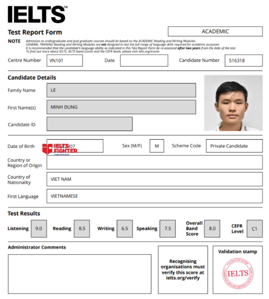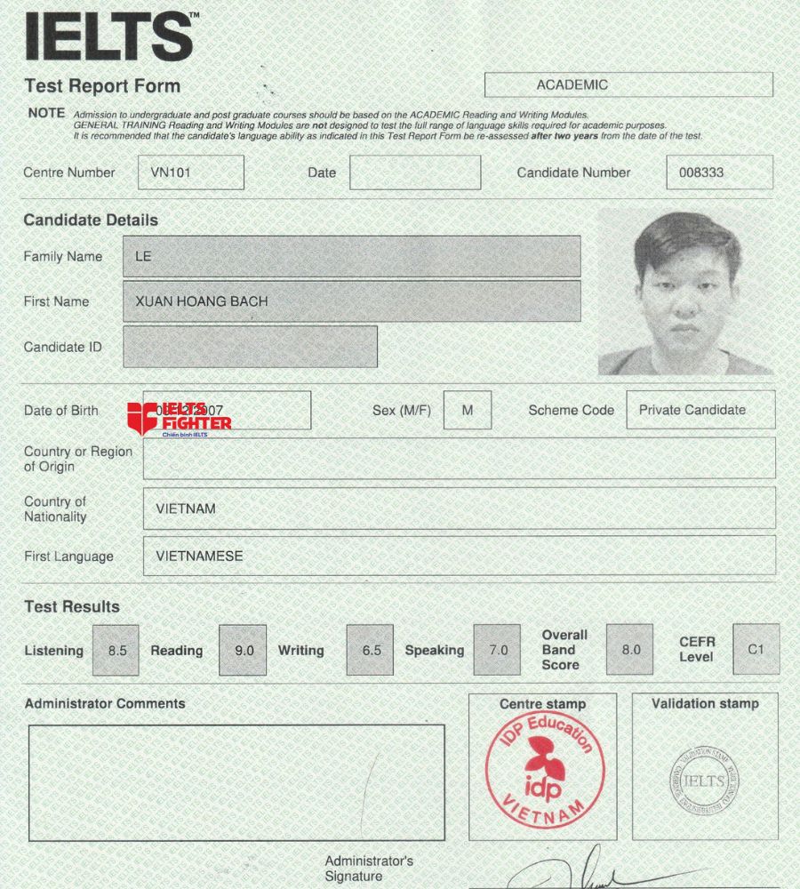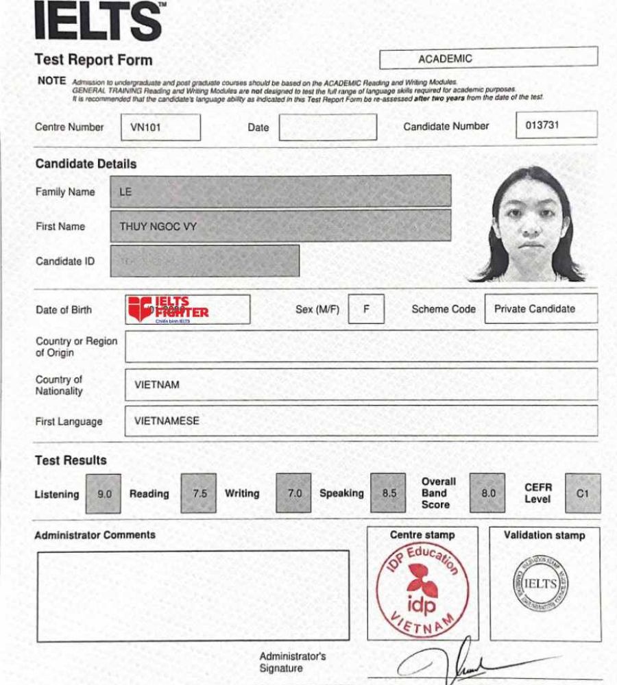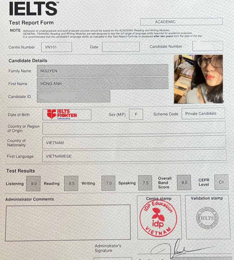 Chào các bạn, mình là Dũng, học sinh lớp FBIE63021 của Ms. Nhi tại cơ sở IELTS Fighter Cộng Hòa, TPHCM. Cuối tháng 9 vừa qua, mình thi IELTS lần đầu tiên và nhận được band overall 8.0. Mình khá bất ngờ và mãn nguyện khi nhận được kết quả này vì nó cao hơn so với aim mình dự kiến hẳn 1 band, hihi...