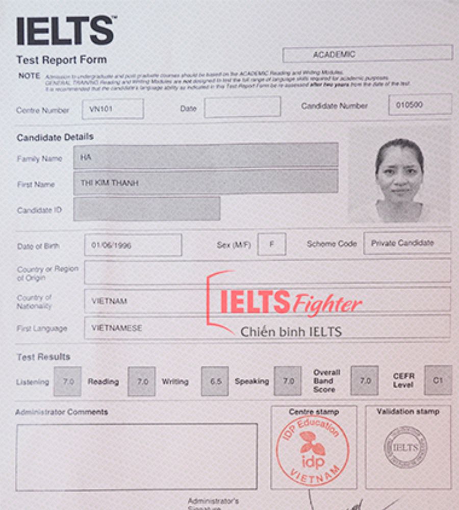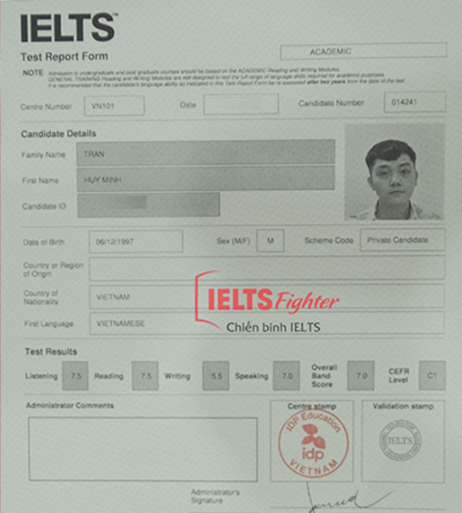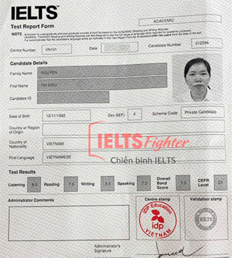 Theo học trung tâm từ lớp F với nền tảng căn bản, qua các level học mình đã được thay đổi cách luyện tập, có chiến thuật làm bài ổn định, phát triển kỹ năng tốt ơn. Mình chân thành cảm quý thầy Cô tại IELTS FIGHTERS đã giảng dạy và hỗ trợ nhiệt tình để mình thi được kết quả này.